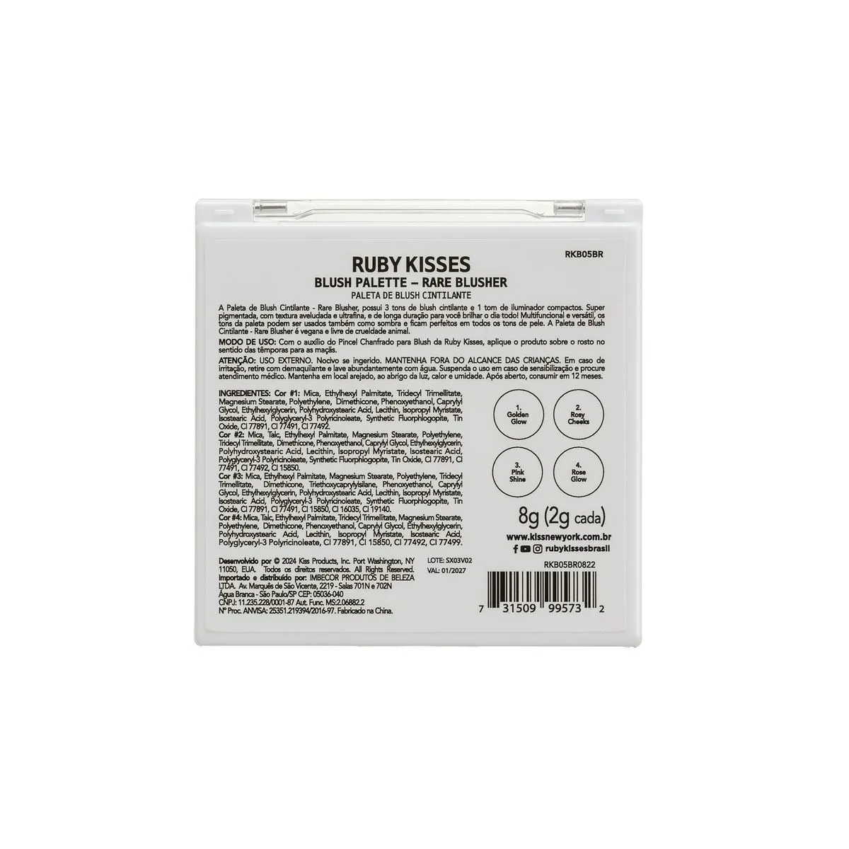 A Paleta de Blush Cintilante – Rare Blusher, foi desenvolvida para trazer lindas e raras partículas de brilho que realcem a sua beleza natural! São 3 tons de blush cintilante e 1 tom de iluminador compactos, com textura macia, super pigmentada e de alta fixação para você brilhar o dia todo! Multifuncional e versátil, os tons da paleta podem ser usados também como sombra e ficam perfeitos em todos os tons de pele. A Paleta de Blush Cintilante – Rare Blusher é vegana e livre de crueldade animal.