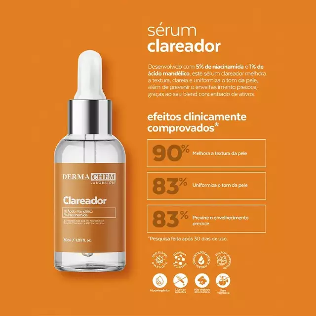 O Sérum Clareador da Dermachem é um tratamento facial desenvolvido para auxiliar na redução de manchas e na uniformização do tom da pele. Sua fórmula possui textura leve e de rápida absorção, proporcionando cuidado eficaz sem deixar sensação pesada ou oleosa.