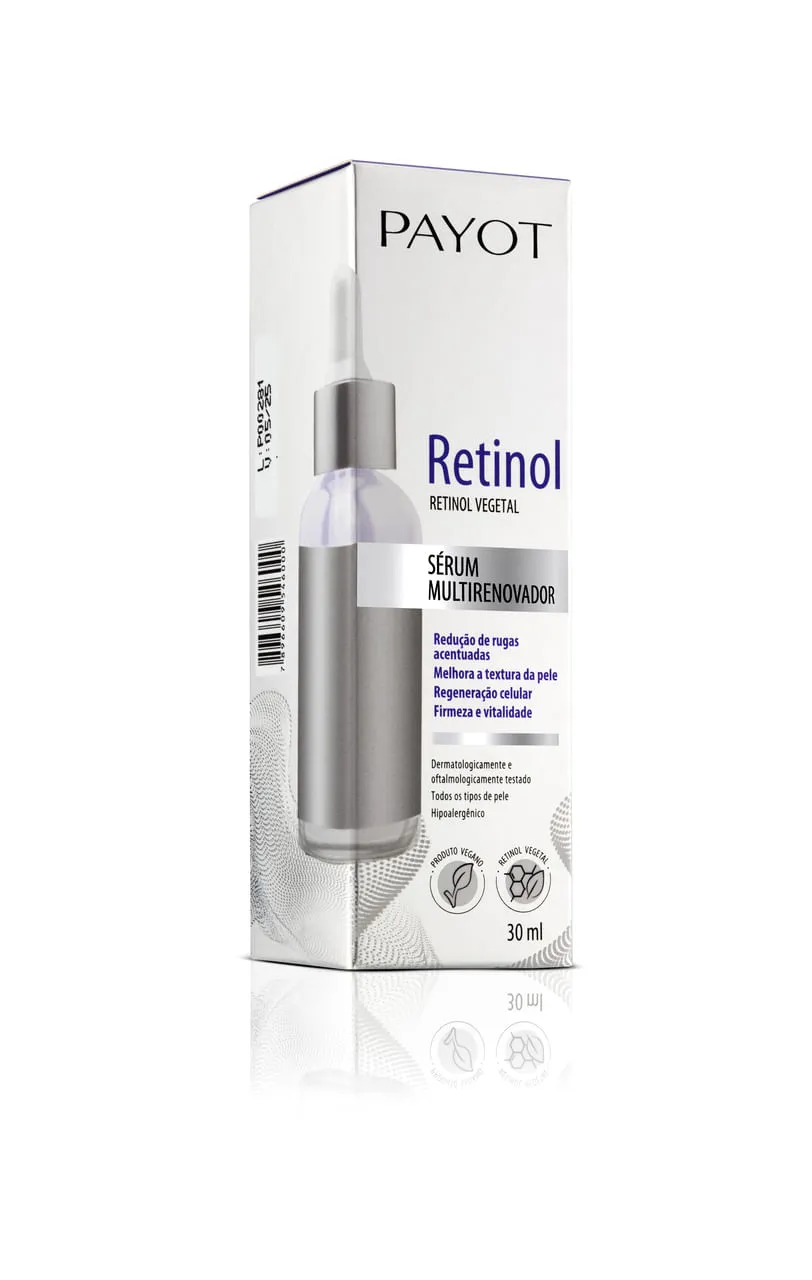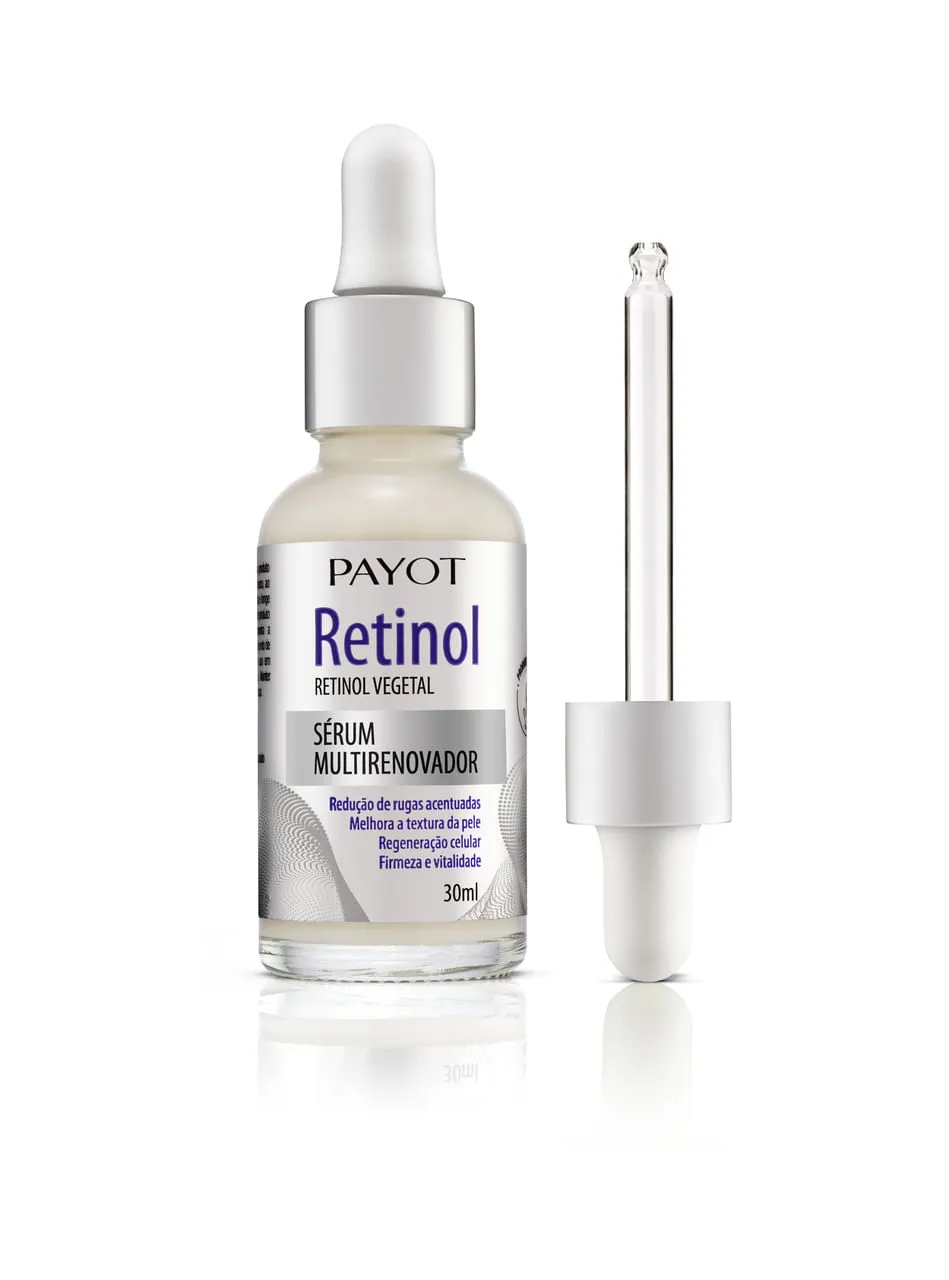 O Sérum Retinol Multirenovador Payot, tem fórmula multifuncional com associação exclusiva de ativos que ajudam na regeneração celular da face e área dos olhos. Auxilia na redução de rugas e linhas de expressão acentuadas. Estimula a produção natural do colágeno, melhora a firmeza, reduz poros dilatados, proporcionando ação completa de rejuvenescimento. Confere melhora da textura e aspecto geral da pele. Utilizamos um ativo de origem vegetal (Phyto-Retinol), que não possui os efeitos adversos do retinol tradicional.
